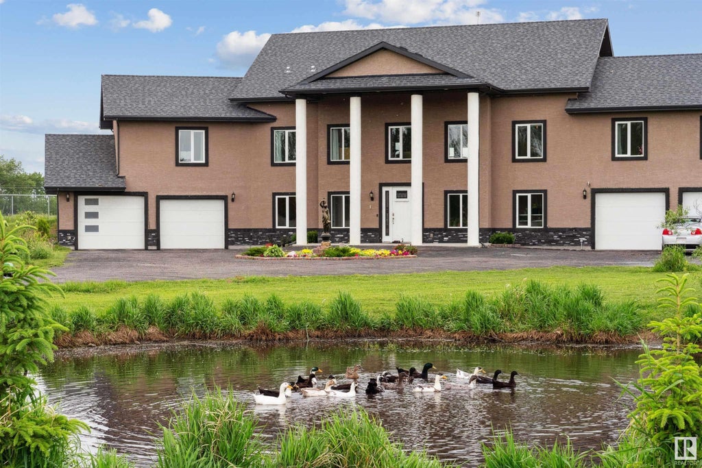 Great opportunity to own this rare beauty and Enjoy life. Located in Paradise Hills, this custom built reverse walkout bungalow offers over 4000 sq ft on two level with 5 bedrooms, 4.5 bathrooms, Quad attached garages on 3.8 acres of land. Unique selling point about this property is the additional entrance from the highway directly onto the back of the land. Great for building shops or outhouses. Home is created in elegant beauty with dark cabinets, strong hardwood floors, wrought iron railings, 12 foot ceilings. The bedrooms are above the garages. There is a beautiful 15 foot deep duck pond in front of the home and flat land, fully fenced. Few minutes to Beaumont or Edmonton and Henday. Great location for your family and kids to enjoy your life and enjoy the spoils of country living. Basement is fully developed into an open area, 5th bedroom, 4th full bathroom. The garages are heated and there is a large deck facing the backyard. Home features Energy Efficient ICF foundations as well. Great home to Own !