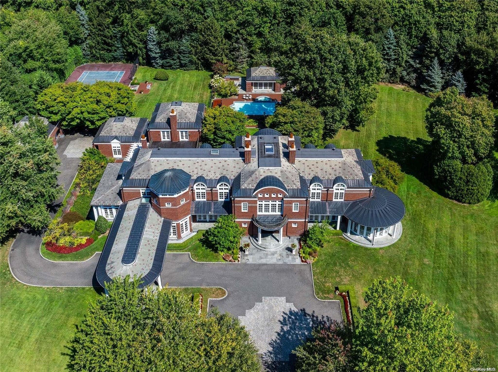 Nestled on a meticulously landscaped 6-acre+ property, Eleven Dupont Court epitomizes architectural sophistication and resplendence. This stately Brookville Brick Colonial, constructed in 2005, spans over 15,000 Sq.Ft. and encompasses 7 Bedrooms and 12 Bathrooms. Its graceful design is distinguished by bespoke features such as elaborate woodwork, spiral staircases, marble flooring and soaring two-story ceilings. Natural light is abundant throughout the entire home, flooding through large windows and multiple sets of French doors. The residence's first floor is dedicated to luxurious entertaining spaces, including a formal Living Room and an elegant Dining Room complete with custom cabinetry. The circular Music Room/Conservatory offers beautiful views of the outdoors and the spacious Den is highlighted by a refined limestone fireplace and a two-story gallery mezzanine that overlooks the lower level. The grand eat-in Kitchen is a culinary masterpiece, featuring dual oversized islands, exquisite coffered ceilings, and top-tier Wolf/SubZero appliances. The backsplash is adorned with Delft tile, adding a touch of classic elegance. The Primary Wing on the second floor includes a private office, a generously sized bedroom with a sitting area and fireplace, a large walk-in closet, and a spa-inspired marble bathroom with a soaking tub. The property is enhanced by numerous outdoor terraces, Crestron and Lutron systems, a four-car attached garage, a whole-house generator, a sophisticated surround sound system and more. Approached via automatic front gates, the estate is accessed through a quarter-mile tree-lined driveway. The outdoor amenities are exceptional, including multiple slate patios for entertaining, a sunken tennis court, an outdoor grilling station, a cabana with a kitchenette, and a gunite in-ground pool with a jetted spa. The property is zoned within the esteemed Jericho Union Free School District.